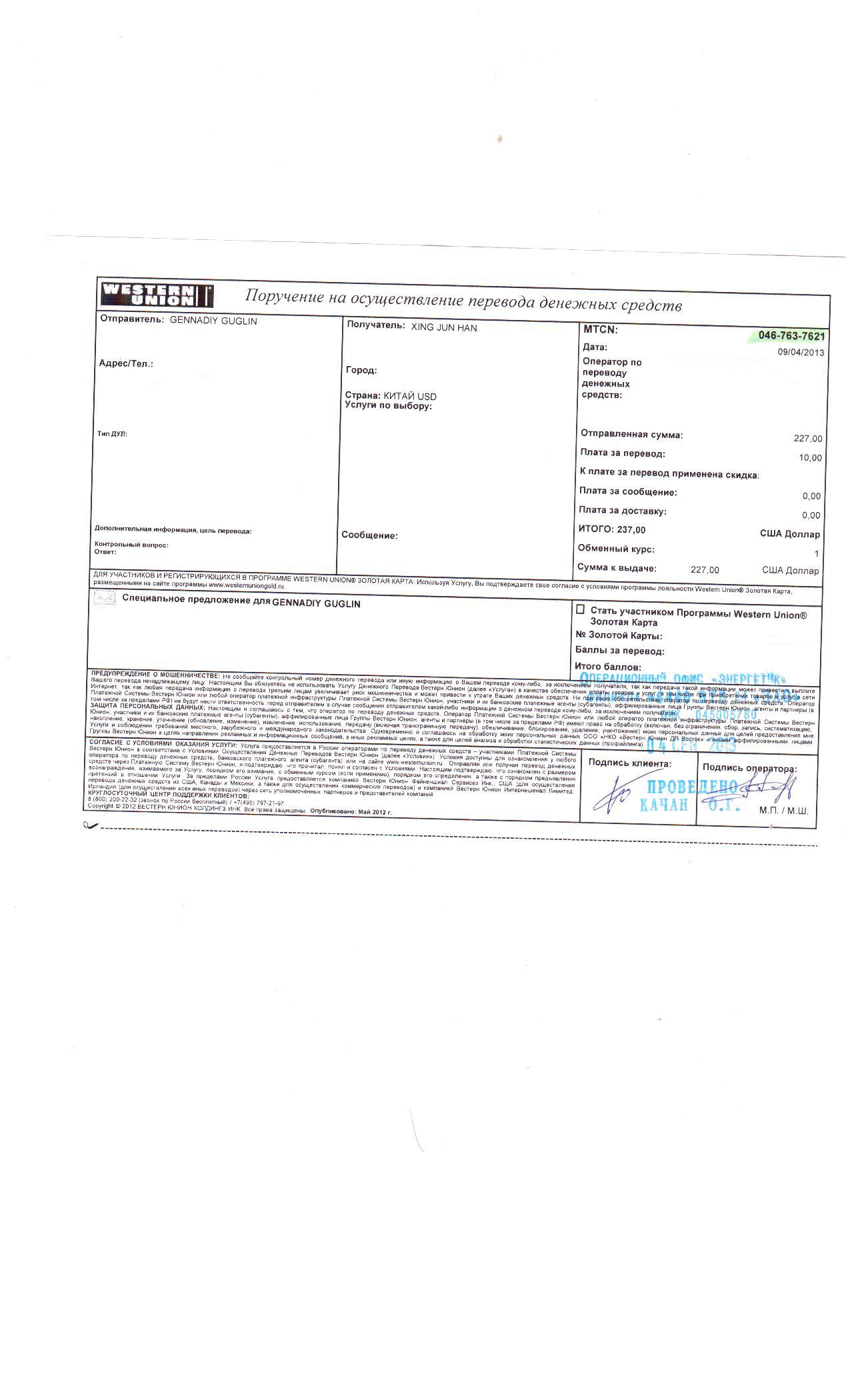Вот так должна выглядеть квитанция денежного перевода Western Union, чтобы деньги дошли до нас.